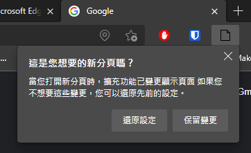 四、最後開個新分頁試試,如果 Edge 有跳出「這是您想要的新分頁嗎?」請點擊「保留變更」。