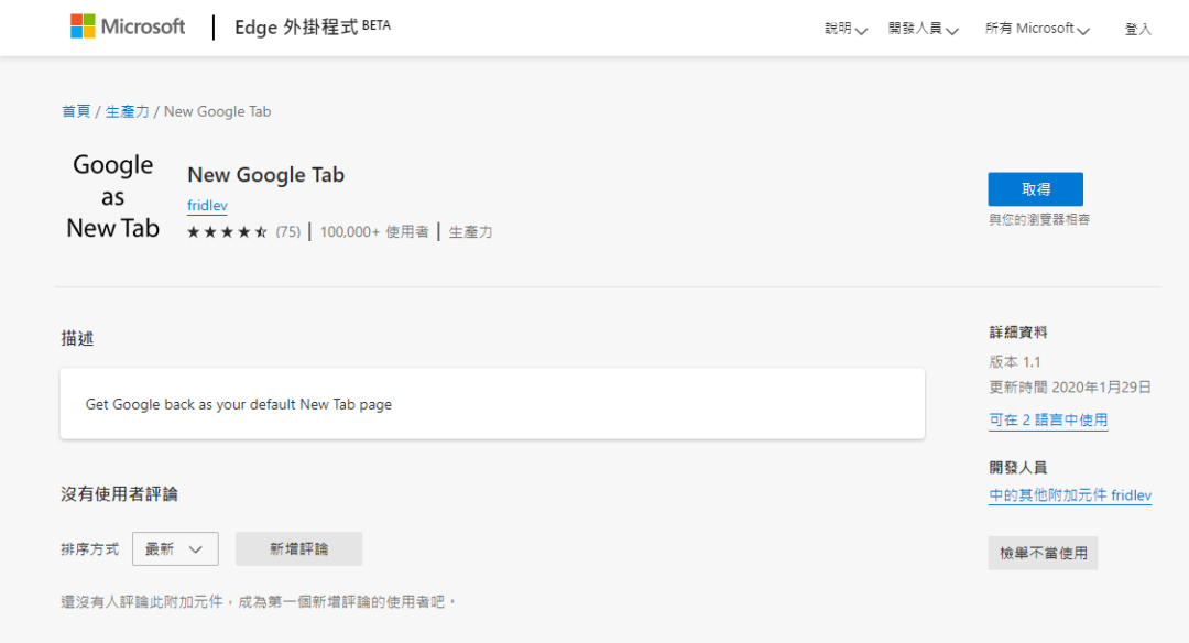 一、使用 Edge 瀏覽器前往 Microsoft Edge 外掛程式 網頁,點擊「取得」開始安裝。