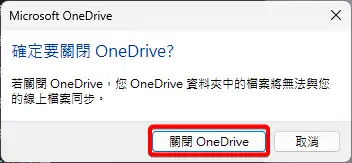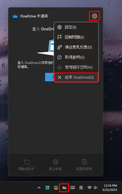 點擊右下角系統匣中的 OneDrive 圖示,再點擊右上角的齒輪中的結束 OneDrive。