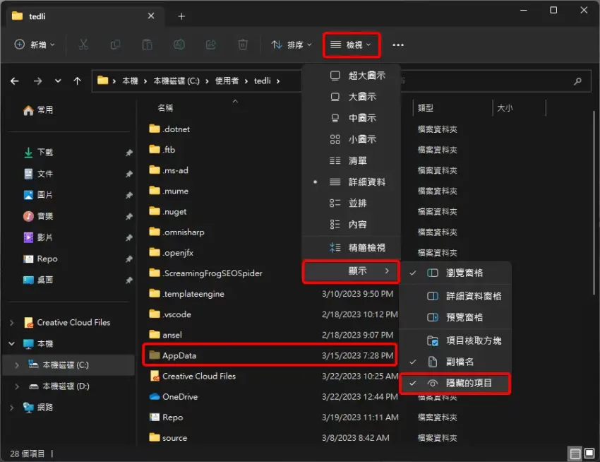 因為接下來需要存取隱藏檔案,請先開啟檔案總管,啟用檢視 / 顯示 / 隱藏的項目,使隱藏檔案可被看見。