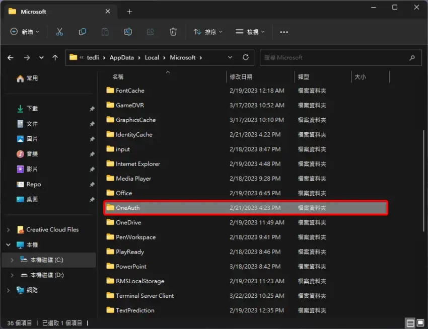 首先要刪除 AppData / Local / Microsoft / OneAuth。
